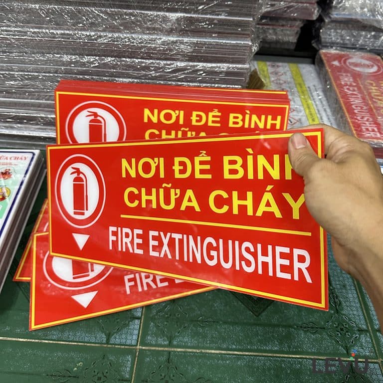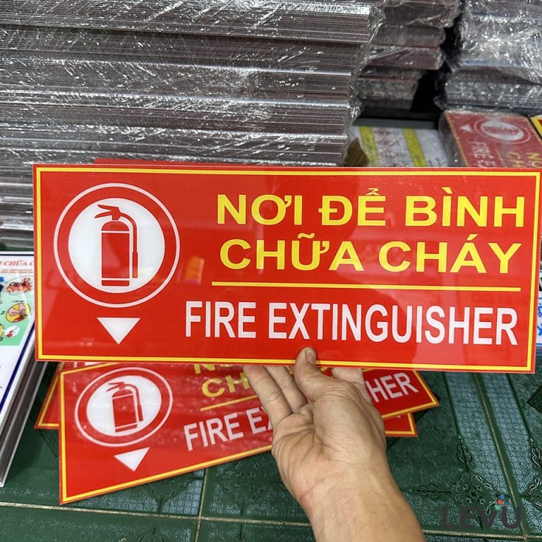 Biển báo chỉ dẫn vị trí nơi để bình chữa cháy được thiết kế kết hợp giữa biểu tượng bên trái kèm nội dung song ngữ nơi để bình chữa cháy (fire extinguisher) bên phải có ứng dụng chỉ dẫn khu vực cụ thể nơi đặt bình hoặc các trang thiết bị pccc tại một vị trí nhất định. Quý khách có thể đặt thiết kế nội dung và kích thước quy cách khác theo yêu cầu.