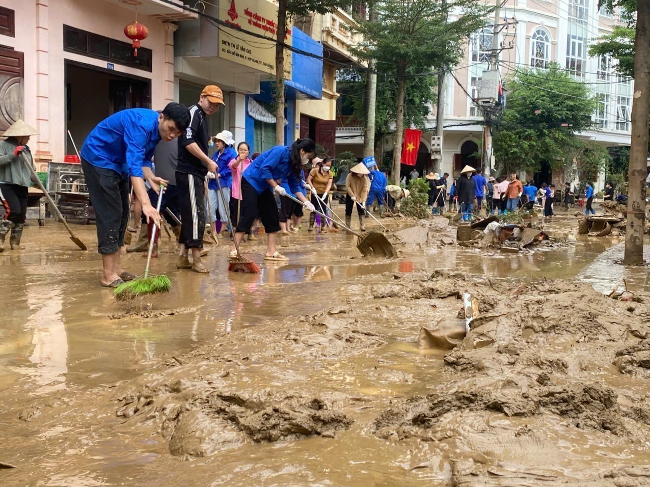 Các lực lượng thanh niên tình nguyện được huy động để giúp dân dọn dẹp nhà ở, vệ sinh đường phố. Ảnh: TTXVN