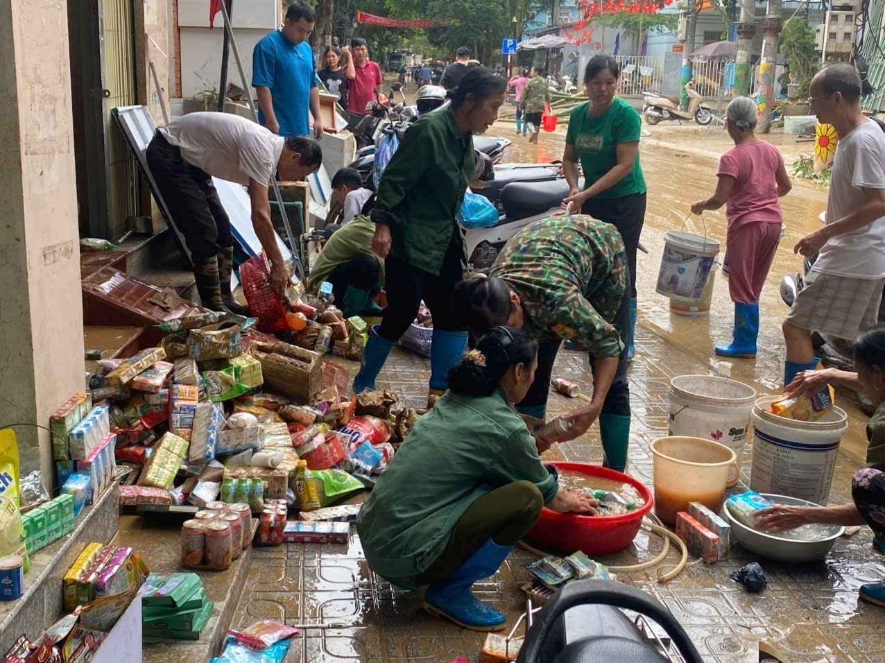 Người dân dọn rửa lại cửa hàng tạp hóa bị ngập nước tại Cao Bằng. Ảnh: TTXVN