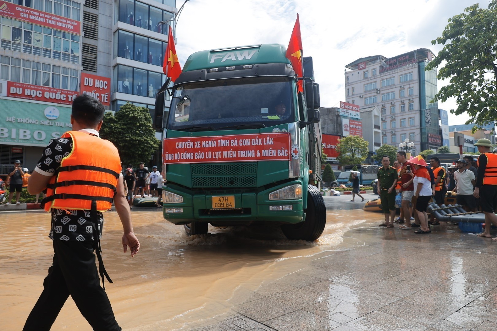 Lực lượng cứu trợ từ khắp nơi tập trung về Thái Nguyên giúp dân khắc phục hậu quả bão lũ. Ảnh: Minh Quyết - TTXVN